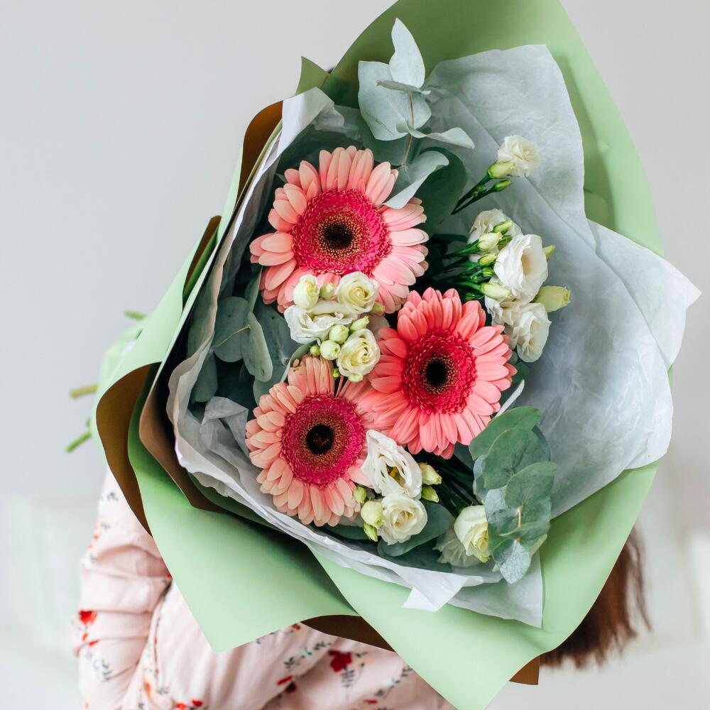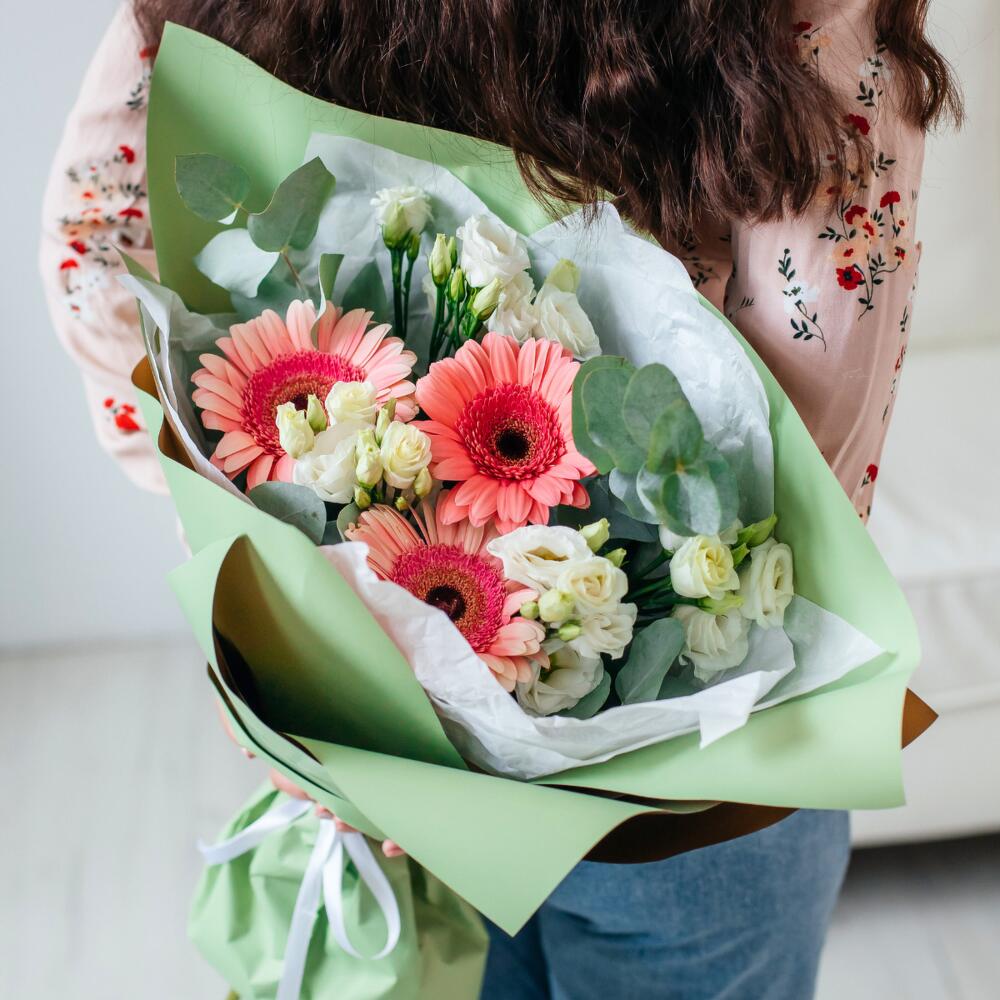 Букет с Герберой, Лизиантусом и Изумрудным Эвкалиптом в Грозном