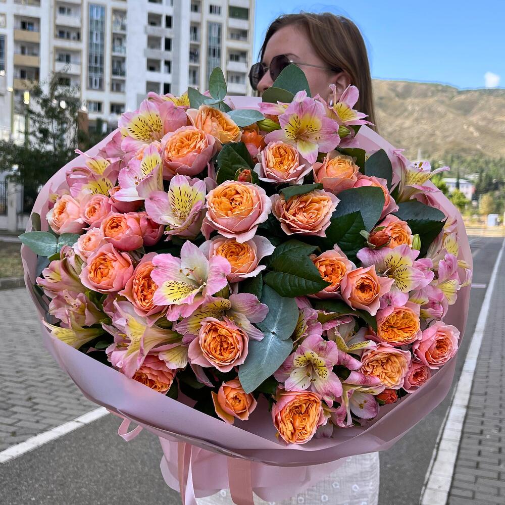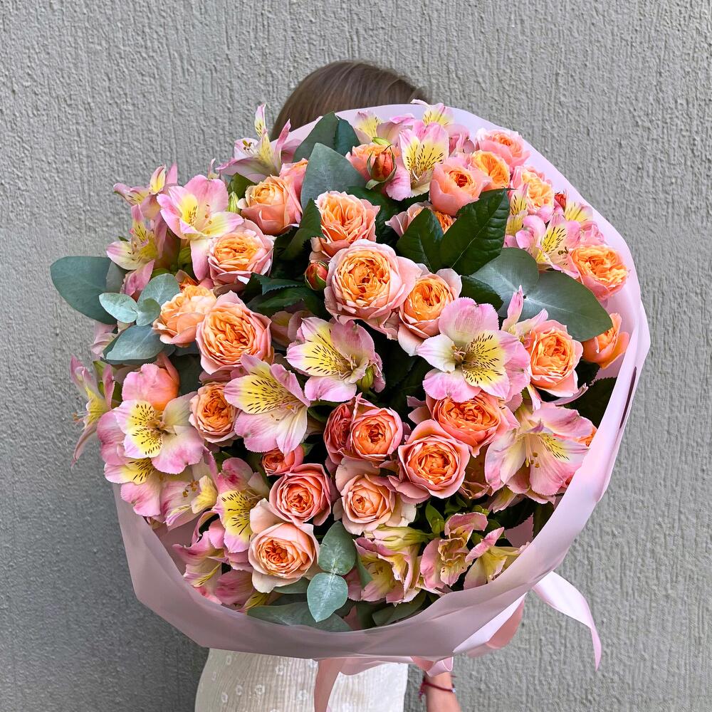 Букет, состоящий из микса роз и альстромерий, представляет собой изысканное сочетание красок, форм и текстур. В этом букете сочетаются изящество роз и яркость альстромерий, создавая впечатление живописного и красочного цветочного сада.